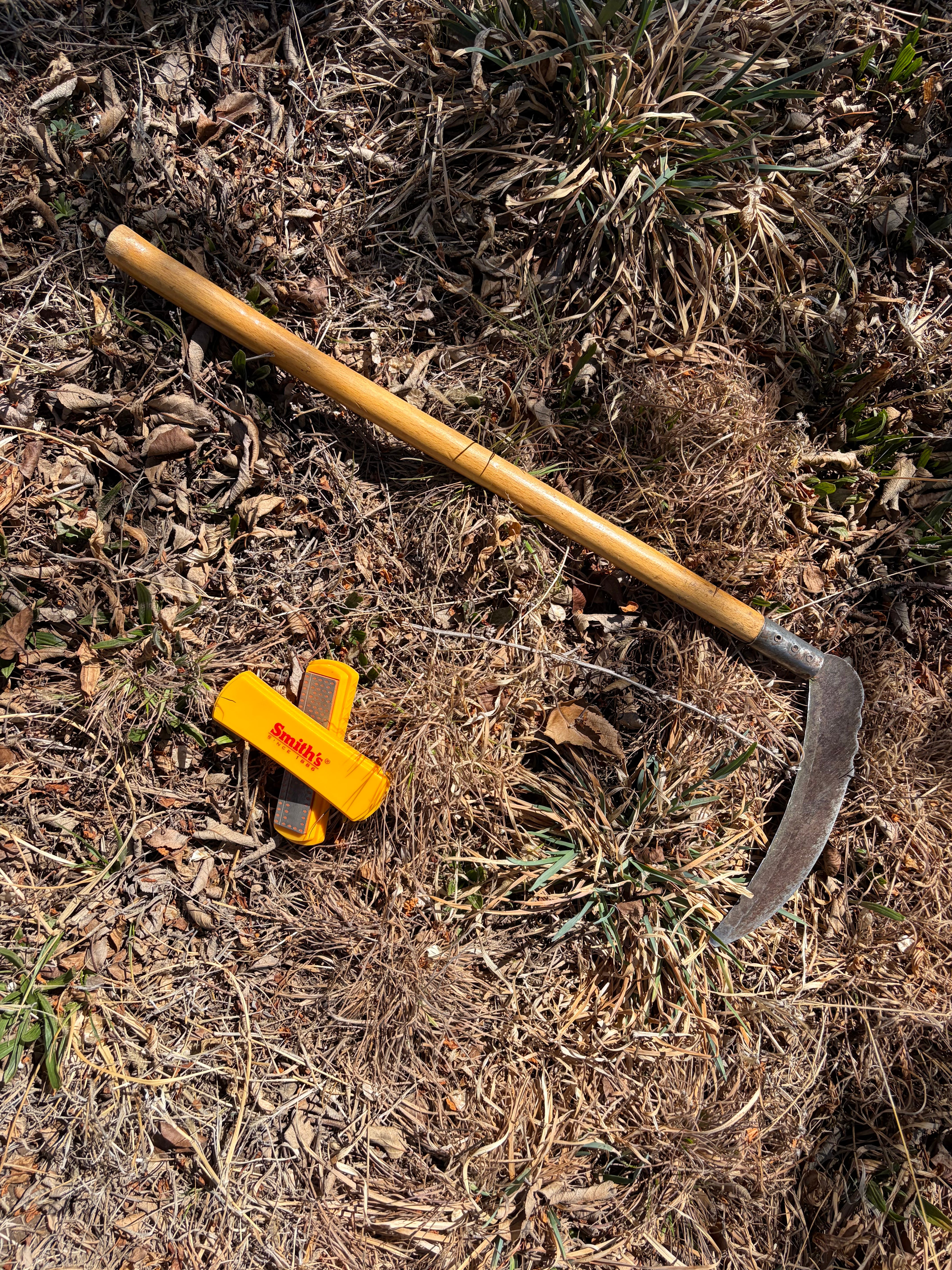 The sickle is balanced, light, and versatile. It’s easy to maneuver, and so long as you keep it sharp, it will easily slice through tall grass and dense ferns, even Siberian Elm saplings. It does not vibrate, is easy on the wrists, and it’s much easier to keep its blade sharp than it is to keep refilling weedwacker wire.