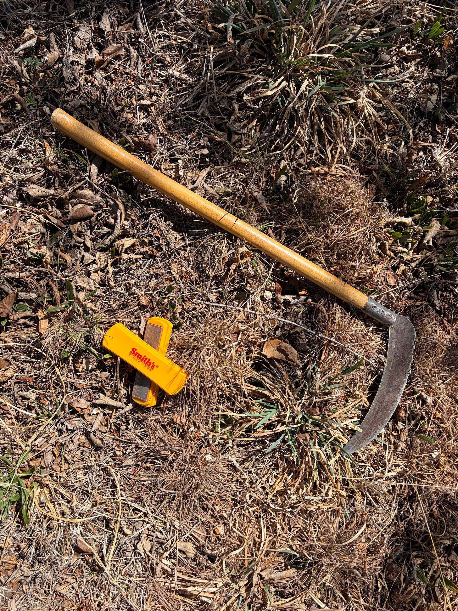 Our string trimmer is…haunted. Something is loose in the trigger assembly but only seems to be an issue some times. On Saturday, its battery was dead, so I grabbed a small sickle and a pocket sized sharpening stone, and sauntered off for a date with the overgrowth.